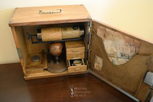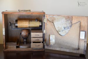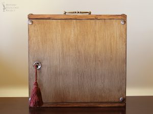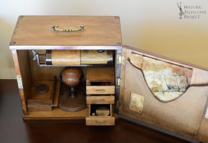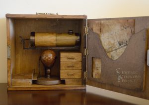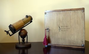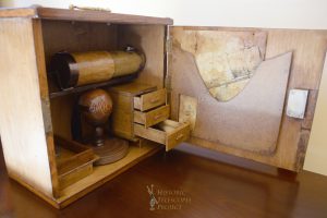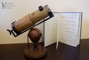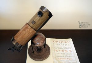 Imágenes del telescopio ya terminado en su caja. No consta en ningún dibujo, manuscrito o carta, que Newton tuviera sus telescopios almacenados en alguna caja en particular. Por todo ello, nos hemos tomado la licencia de construir una caja acorde al telescopio.